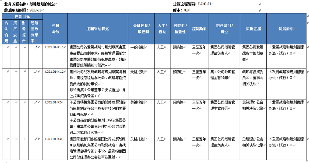 2、按照企事業(yè)單位所應遵循的內控要求(上市公司內控指引、國資68號文等)開展管理要素與活動的梳理,編制內控體系文件,包括流程圖、風險控制矩陣以及相應制度文件的修改,形成《內部控制手冊》