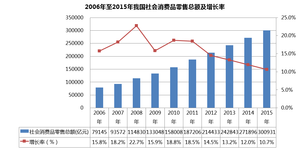 自2006年開始的十年間,我國的社會(huì)消費(fèi)品零售總額逐年穩(wěn)定增長(zhǎng),但增速在逐漸下滑。