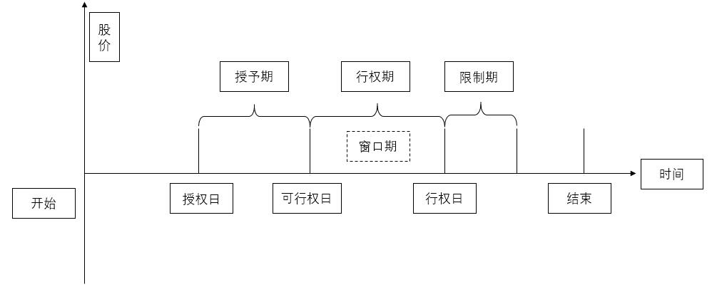 股票期權(quán)是一種看漲期權(quán),如圖2-2所示示,經(jīng)營(yíng)者獲得行權(quán)權(quán)的日期為行權(quán)權(quán)的授予日,行權(quán)權(quán)授予日和股票期權(quán)到期日之間為行權(quán)期;在行權(quán)權(quán)被授予后,經(jīng)營(yíng)者可行使期權(quán)購買股票。一般情況下,股票期權(quán)是無償授予的。也有些公司在授予股票期權(quán)時(shí)計(jì),為了增加對(duì)經(jīng)理人的約束力, 要求經(jīng)理人支付一定的費(fèi)用,就是期權(quán)費(fèi)。