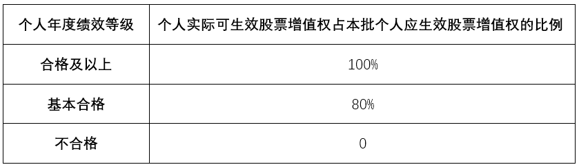 若激勵(lì)對(duì)象某一股票增值權(quán)行權(quán)期的個(gè)人年度績(jī)效等級(jí)為基本合格或以上,則其當(dāng)期績(jī)效表現(xiàn)達(dá)到生效條件,在滿足其他生效條件下,可以申請(qǐng)當(dāng)期實(shí)際可生效股票增值權(quán)的行權(quán);若激勵(lì)對(duì)象的個(gè)人年度績(jī)效等為不合格,則其當(dāng)期業(yè)績(jī)表現(xiàn)未達(dá)到生效條件,取消其該期股票增值權(quán)行權(quán)資格。