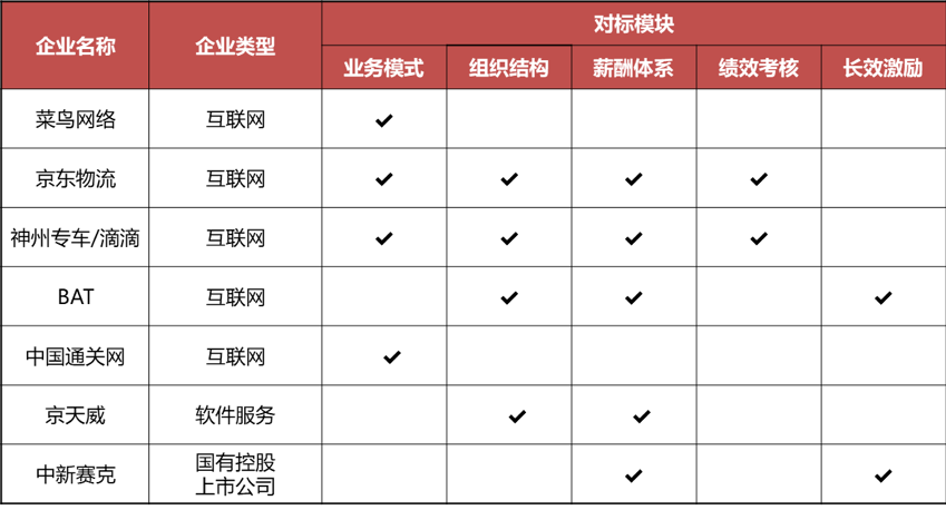 1、對標(biāo)研究:項(xiàng)目組分別選取10家公司的5個模塊進(jìn)行對標(biāo),對企業(yè)的業(yè)務(wù)模式、組織結(jié)構(gòu)、薪酬、績效、長效激勵模式提出啟示和建議。
