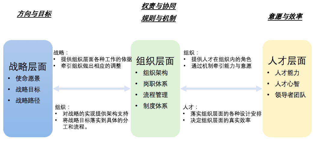 從上圖可見,組織層面的各種設計,組織架構和管控,流程設計、各種制度,也包含人力資源相關的考核、薪酬、干部管理、勞動關系與用工、招聘配置等等的具體規(guī)則,既承接了戰(zhàn)略目標,為具體的戰(zhàn)略實現(xiàn)服務,也需要隨著戰(zhàn)略的調整而調整,同時,組織層面的各種設計,也決定了對人才的具體角色要求,角色要求既代表著對人才標準的要求,同時也通過各種流程制度形成機制牽引著人才能力的發(fā)揮和心智的改善,當然,人才層面的各種要素的表現(xiàn)水平也直接影響者組織層面各種設計的實際運行效率,并且有可能倒逼組織層面進行相應的調整,比如人才能力不能支持組織層面的設計,或組織層面的設計無法充分發(fā)揮人才的能力時。所以人才管理體系設計的重點就在于如何在組織層面通過制度設計,配合相應的工具方法,最終在人才層面達到想要的結果,從而將戰(zhàn)略層面與人才層銜接起來。