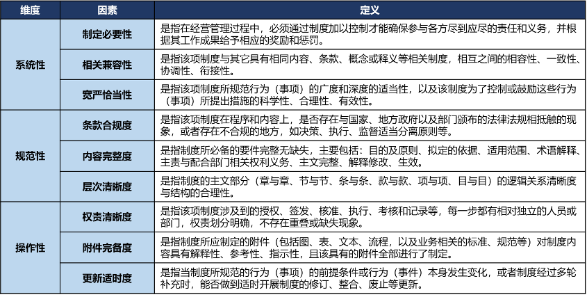 另一方面,針對單個制度,按照PDCA循環(huán)、業(yè)務(wù)流、風(fēng)險管控等管理理念對制度內(nèi)容框架及核心內(nèi)容進(jìn)行梳理,并由主責(zé)部門與項目組進(jìn)行反復(fù)溝通討論,單項制度的合理有效性、與實際業(yè)務(wù)的契合性、執(zhí)行效度與風(fēng)險防范性以及可落地性得到了進(jìn)一步深化。