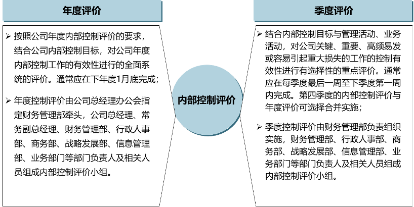 項目組同公司領(lǐng)導(dǎo)、主要業(yè)務(wù)部門對內(nèi)控評價組織機構(gòu)、關(guān)注內(nèi)容、評價基本要求與評價方法、評價程序、評價工作的監(jiān)督與考核及評價所需相關(guān)表單進(jìn)行研討,最終確定公司季度評價與年度評價相結(jié)合的評價方式。