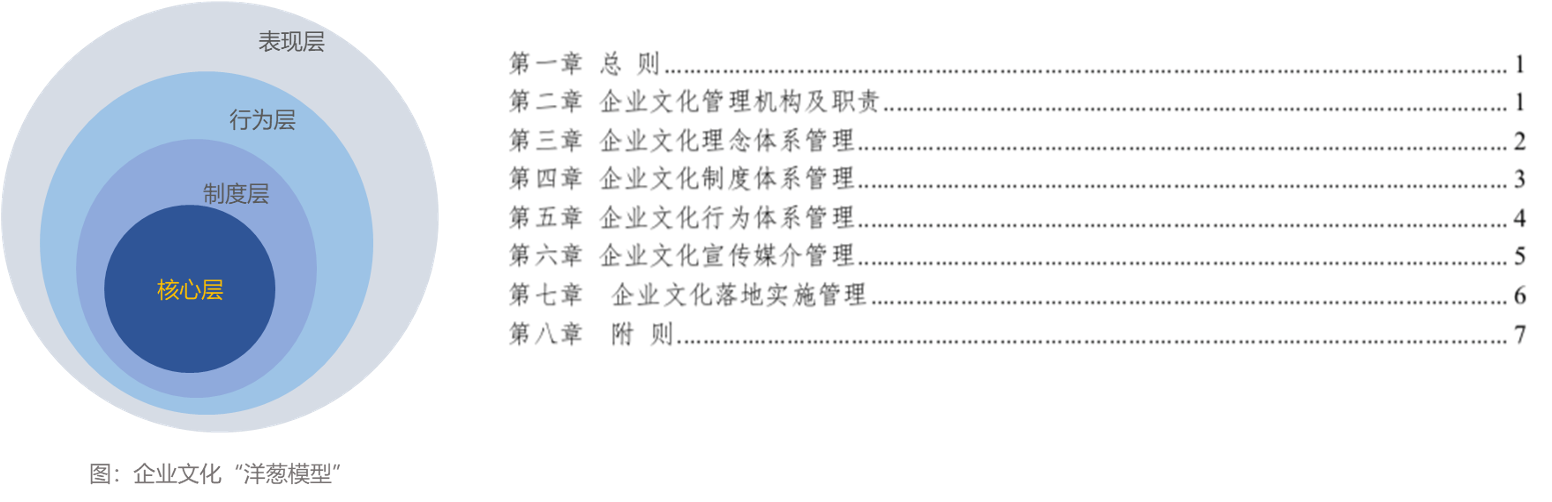 《集團(tuán)企業(yè)文化管理制度》是企業(yè)文化工作的綱領(lǐng)性文件,以企業(yè)文化“洋蔥模型”為基礎(chǔ),對企業(yè)文化管理工作的組織架構(gòu)、企業(yè)文化工作范疇、工作內(nèi)容和工作重點進(jìn)行規(guī)范和說明,二階段主要工作內(nèi)容也基本圍繞本制度主體內(nèi)容組織開展。