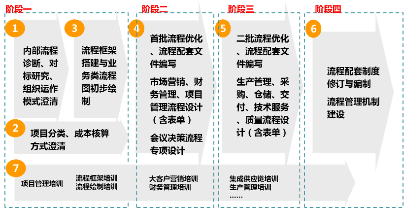 第二階段:主要為首批流程優(yōu)化、流程配套文件編寫,包含市場營銷、財(cái)務(wù)管理、項(xiàng)目管理流程設(shè)計(jì)(含表單)、會議決策流程專項(xiàng)設(shè)計(jì)。
