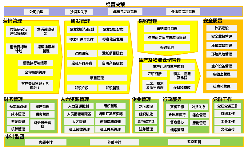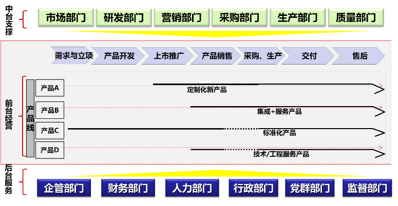 組織運(yùn)作機(jī)制可以整體概括為:前臺經(jīng)營、中臺支撐、后臺服務(wù)。流程體系設(shè)計(jì)需要以組織架構(gòu)為基礎(chǔ)和前提,因此,項(xiàng)目組將通過行業(yè)最佳實(shí)踐、能源技術(shù)公司組織運(yùn)作模式分析,與能源技術(shù)公司中高層進(jìn)行充分研討,進(jìn)一步明確組織架構(gòu)及運(yùn)作模式。項(xiàng)目組初步認(rèn)為,能源技術(shù)公司需要建立以產(chǎn)品線為主線,中臺和后臺全力支撐產(chǎn)品,從需求立項(xiàng)、開發(fā)、上市推廣、銷售、采購生產(chǎn)、交付、售后的全生命周期組織運(yùn)作機(jī)制,打破部門墻,建立矩陣式柔性組織體系,支撐流程的高效運(yùn)轉(zhuǎn)。