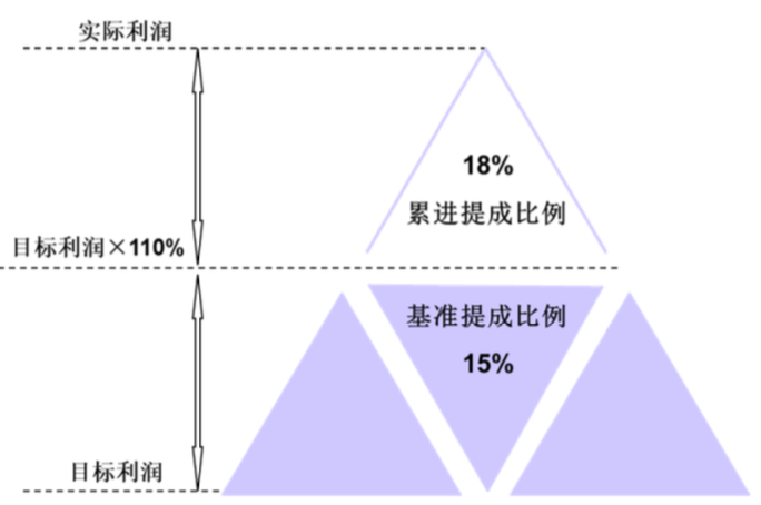 (2)確定超額利潤提成額的計(jì)算公式:為充分激勵(lì)項(xiàng)目公司的骨干員工,提成比例分為“基準(zhǔn)提成比例”和“累進(jìn)提成比例”,分別針對(duì)不同超額部分設(shè)定,如下圖: