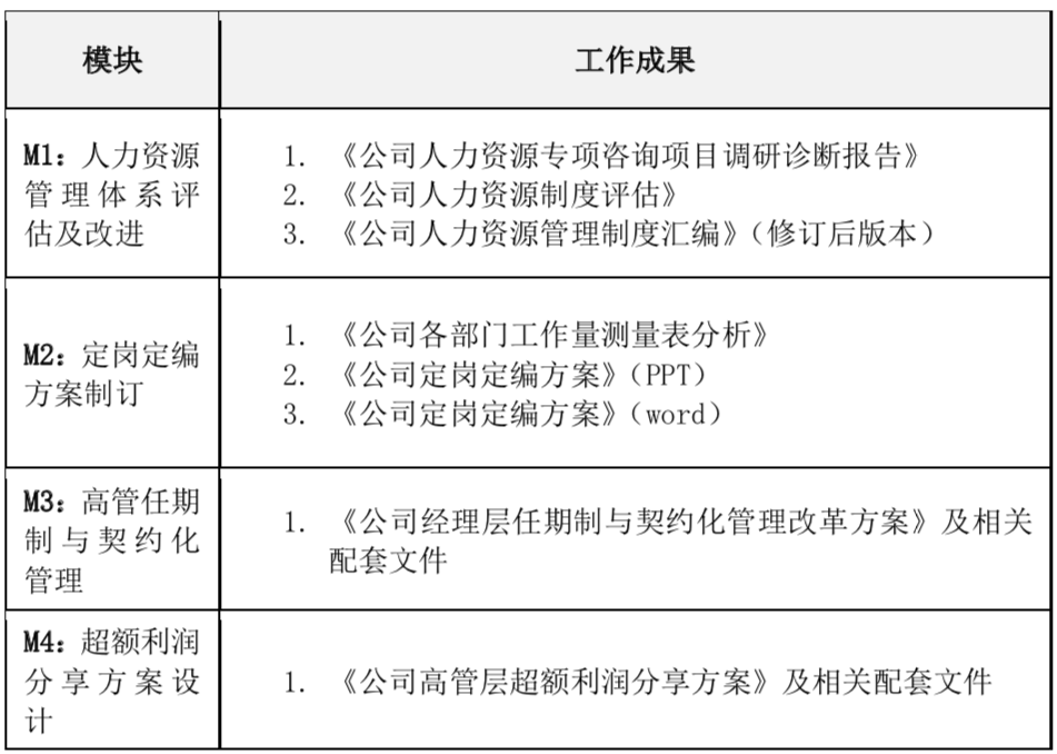 (1)人力資源制度評(píng)估:對(duì)公司現(xiàn)有16項(xiàng)人力資質(zhì)制度進(jìn)行評(píng)估,并提出修改意見;