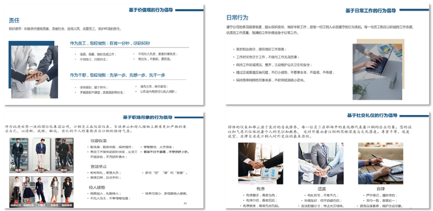 企業(yè)文化行為體系是企業(yè)文化核心理念在行為層面的延伸,既是對全體員工在工作中應(yīng)遵循的關(guān)鍵行為提出的倡導(dǎo)和建議,也是員工踐行企業(yè)文化的具體要求和規(guī)范。在這部分內(nèi)容里,項(xiàng)目組從價(jià)值觀、日常工作、職場形象和社交禮儀四個(gè)層面分別對關(guān)鍵行為進(jìn)行了具體描述。