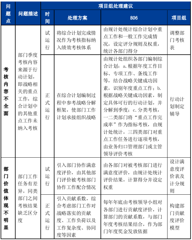 以第二季度數(shù)據(jù)為基礎(chǔ),選擇六個部門開展考核試點,試點部門包括一線業(yè)務(wù)部門、業(yè)務(wù)支持部門和職能部門。部門考核試點反饋出在數(shù)據(jù)來源、權(quán)重設(shè)定、評分規(guī)則制定等方面存在一些操作性問題,在考核體系過渡階段,考核內(nèi)容全面性、部門價值體現(xiàn)等需要結(jié)合研究所原有績效體系的特點進行調(diào)整和融合。