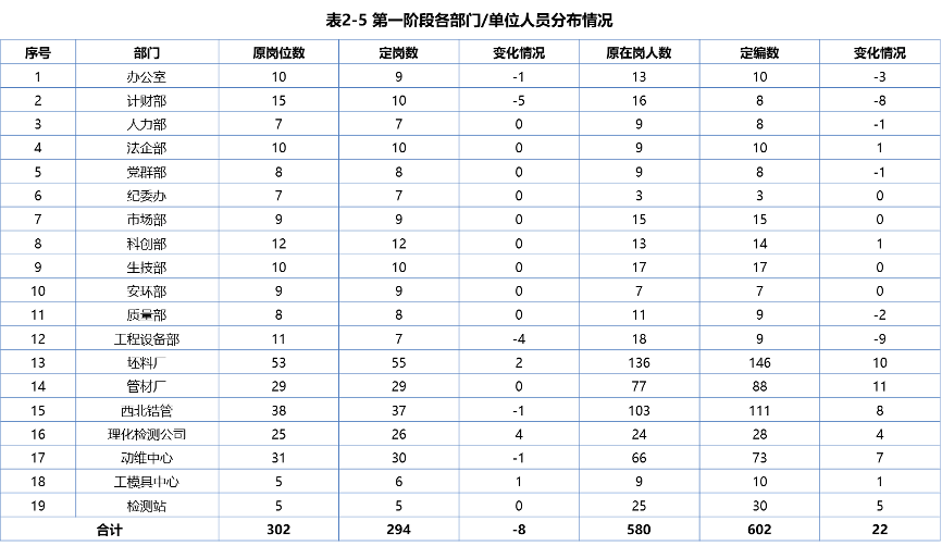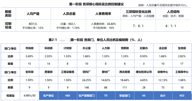 根據(jù)綜合測(cè)算分析,建議公司第一階段人均產(chǎn)值、人員總量、人事費(fèi)用率、三項(xiàng)指標(biāo)變化比例、人員結(jié)構(gòu)以及各單位人員占比等相關(guān)定編數(shù)據(jù)按以下結(jié)果進(jìn)行控制: