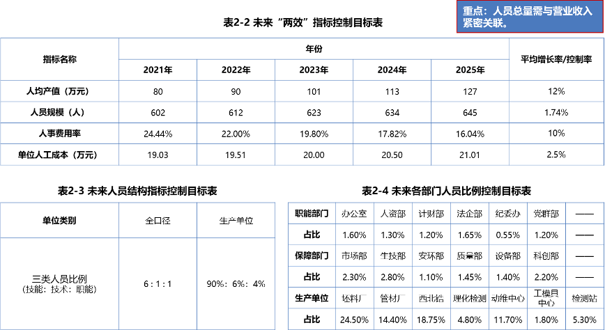 (1)根據(jù)公司戰(zhàn)略規(guī)劃,結(jié)合十四五末公司生產(chǎn)經(jīng)營(yíng)目標(biāo),充分考慮勞產(chǎn)率、管理創(chuàng)新、技術(shù)進(jìn)步、智能制造等內(nèi)外部因素,對(duì)標(biāo)行業(yè)先進(jìn),確定公司宏觀定編方案,實(shí)現(xiàn)總體編制結(jié)構(gòu)合理、人工效率與效益最大化;