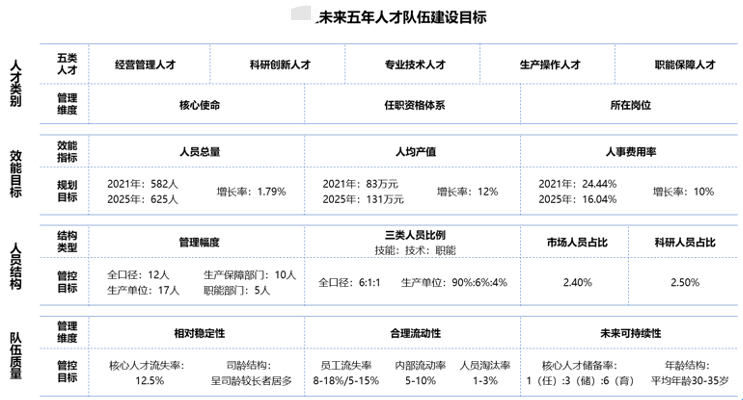 從人才類別、效能目標(biāo)、人員結(jié)構(gòu)、隊(duì)伍質(zhì)量四個(gè)方面開展人才隊(duì)伍建設(shè),為公司戰(zhàn)略目標(biāo)的達(dá)成提供充足的人才保障與支持。