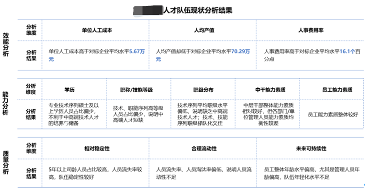 總結(jié):效能方面,公司當(dāng)前人效、錢效與對(duì)標(biāo)企業(yè)相比均有一定差距;能力方面,技術(shù)序列高學(xué)歷、高職級(jí)人員占比偏少,且職級(jí)梯隊(duì)化欠佳;質(zhì)量方面,員工隊(duì)伍穩(wěn)定性較好,外部流動(dòng)性不足,年輕化程度不足。