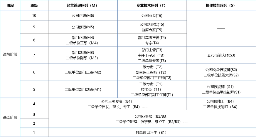 根據(jù)集團(tuán)公司員工職業(yè)發(fā)展通道優(yōu)化設(shè)計(jì)公司職業(yè)發(fā)展通道:1)將職級(jí)調(diào)整為10級(jí);2)與職級(jí)對(duì)應(yīng)修訂各序列職等名稱。