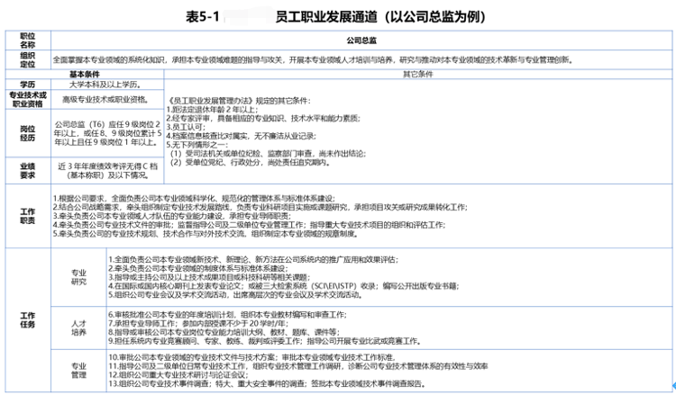 (3)參照集團(tuán)員工職業(yè)發(fā)展通道設(shè)置方案,提出公司崗位體系和職級(jí)體系優(yōu)化調(diào)整建議,實(shí)現(xiàn)與集團(tuán)員工職業(yè)發(fā)展通道的對(duì)接。