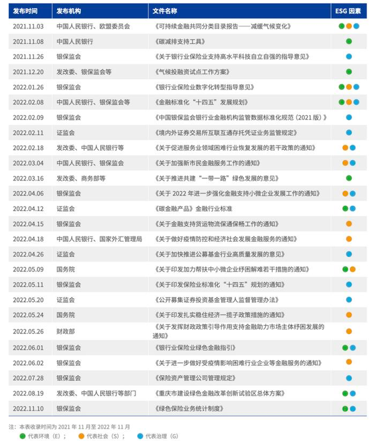 雖然ESG這一概念在2007年才被正式提出來,但是進入21世紀以來,我國陸續(xù)出臺了一系列相關(guān)政策法規(guī)來規(guī)范和引導ESG活動。 最早可追溯到2002年初,中國證監(jiān)會、原國家經(jīng)濟貿(mào)易委員會聯(lián)合發(fā)布了《上市公司治理準則》,闡明了我國上市公司治理的基本原則,自此至2022年底,我國一共出臺了84部政策法規(guī)。僅2021年11月至2022年11月一年內(nèi)的ESG相關(guān)政策文件就有22個(如下圖)。