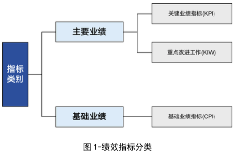 不同考核方式績效指標(biāo)分類不同。本文的績效指標(biāo)是以關(guān)鍵業(yè)績指標(biāo)(KPI,Key Performance Indicator )、重點改進工作(KIW,Key Improvement Works)和基礎(chǔ)業(yè)績指標(biāo)(CPI,Common Performance Indicator)三類指標(biāo)構(gòu)成的指標(biāo)體系。指標(biāo)覆蓋了了企業(yè)的經(jīng)營類、管理類、專業(yè)類、協(xié)調(diào)類等工作,可以實現(xiàn)對企業(yè)與員工績效系統(tǒng)性考核與評價。見圖1-績效指標(biāo)分類。