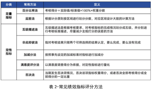 績效考核指標(biāo)一般分為定性指標(biāo)與定量指標(biāo)兩類,不同指標(biāo)的評分規(guī)則與評分方法不同,詳見表2-常見績效指標(biāo)評分方法。