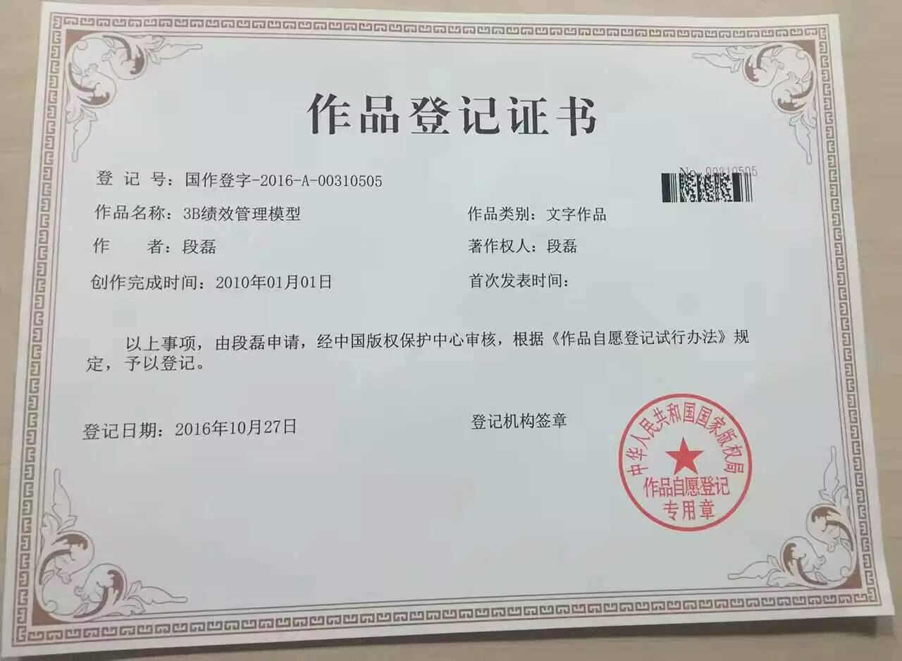 近日,漢哲管理咨詢公司《3B績(jī)效管理模型》正式獲得中華人民共和國(guó)著作權(quán)證書(shū)。