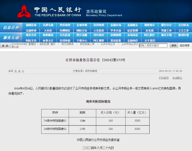 8月29日,中國人民銀行以數(shù)量招標(biāo)方式進行了公開市場業(yè)務(wù)現(xiàn)券買斷交易,從公開市場業(yè)務(wù)一級交易商買入4000億元特別國債。其中,10年期24續(xù)作特別國債01買入量3000億元,15年期24續(xù)作特別國債02買入量1000億元。