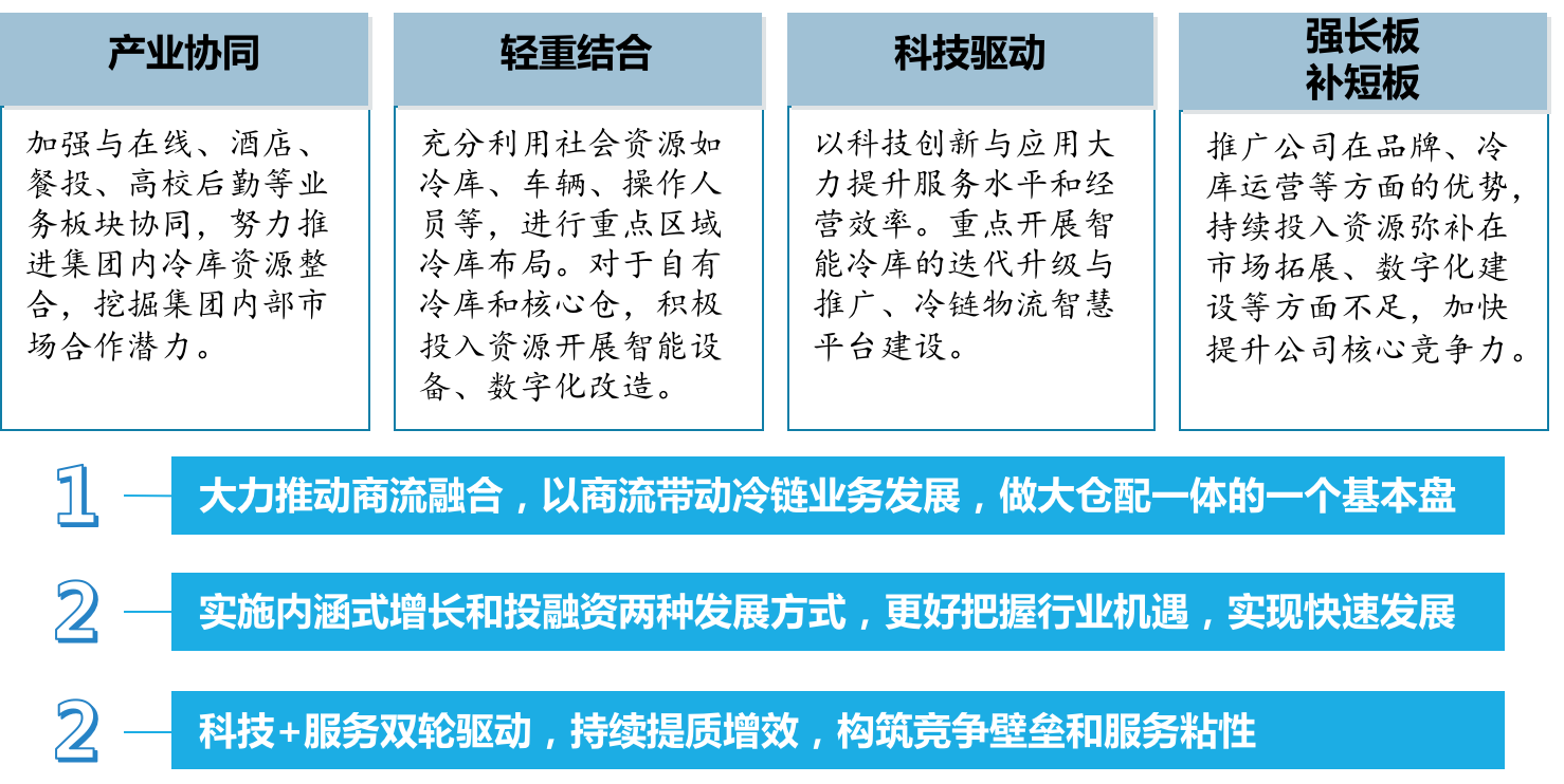 冷鏈以產(chǎn)業(yè)協(xié)同、輕重結合、科技驅動、強長板補短板為發(fā)展原則,實施“122”的發(fā)展策略,以倉配一體業(yè)務為核心,滿足一站式冷鏈服務需求,加快成為國內(nèi)食品冷鏈頭部企業(yè)。