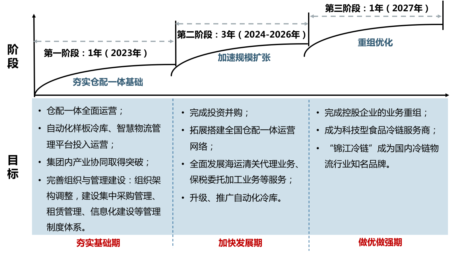 通過五年三步走來實現(xiàn)戰(zhàn)略目標。第一階段夯實倉配一體基礎,第二階段通過投資并購,實現(xiàn)加速發(fā)展。第三階段開展業(yè)務重組,進一步做優(yōu)做強。