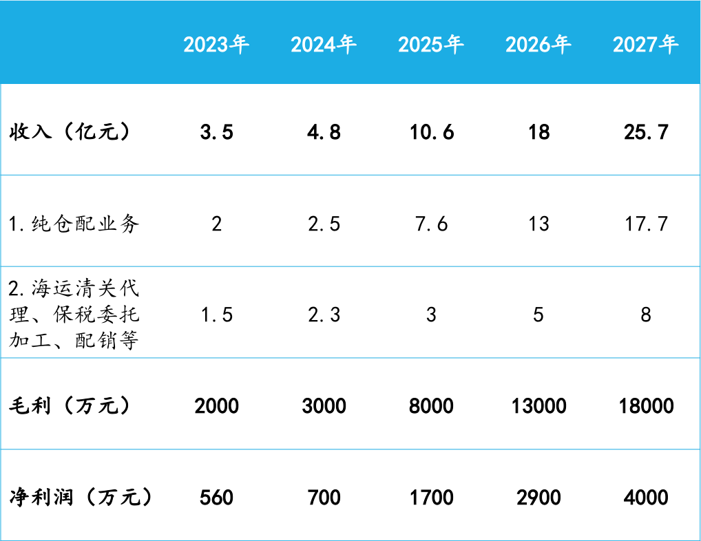 (3)純倉配業(yè)務凈利潤率按平均2%計,海運清關代理等業(yè)務凈利潤率按平均0.6%計。