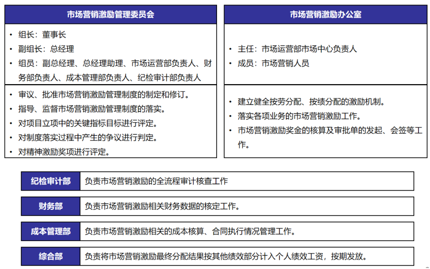 為確保市場(chǎng)營(yíng)銷(xiāo)激勵(lì)高質(zhì)量執(zhí)行,開(kāi)展組織功能設(shè)計(jì)明確對(duì)應(yīng)權(quán)責(zé)。