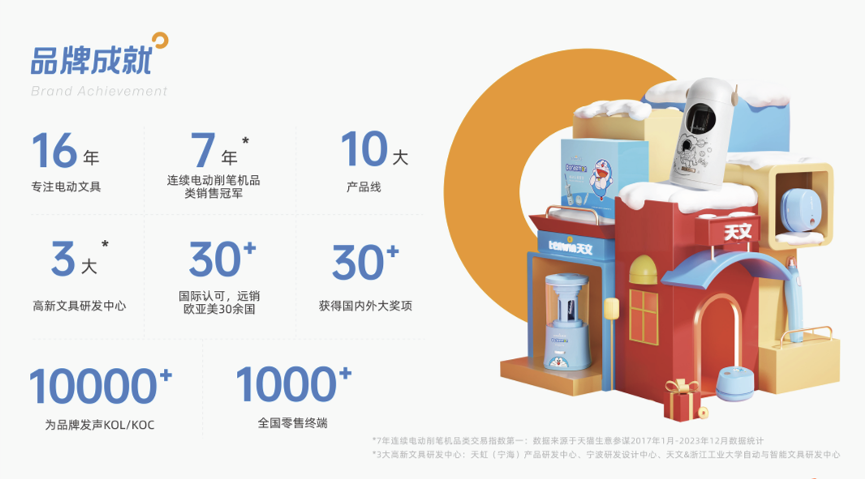 擁有“天文”(tenwin)品牌的寧波天虹文具有限公司創(chuàng)建于1989年,擁有員工2000多人,是一家具備完整產(chǎn)業(yè)鏈和多元化產(chǎn)品線的現(xiàn)代企業(yè)集團(tuán),旗下“天文”品牌十余年專注于自動與智能文具的研發(fā)與制造,擁有電動削筆機(jī)、自動文具、矯姿用品、包袋用品、創(chuàng)意益智、習(xí)慣養(yǎng)成、美術(shù)用品、電動文具套裝八大產(chǎn)品線,致力于成為自動文具領(lǐng)域的先鋒,讓每一個消費(fèi)者都能享受到簡單易用、省時省力、優(yōu)品美感、優(yōu)越體驗(yàn)的新一代智能文具產(chǎn)品。