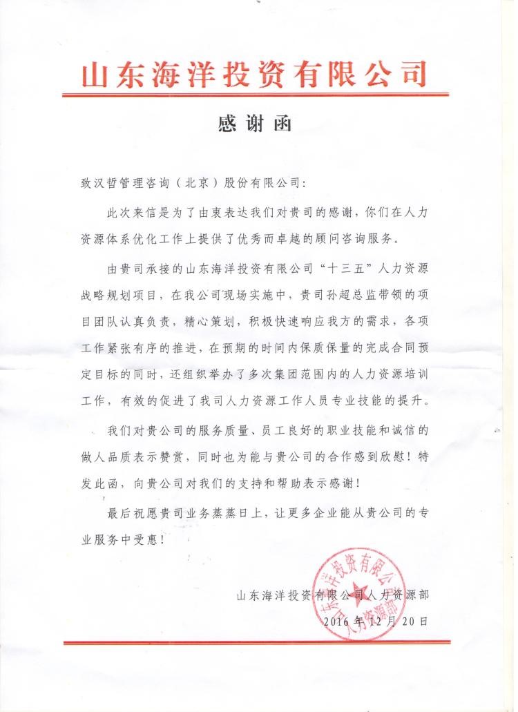 項(xiàng)目完成之際,山東海洋集團(tuán)向漢哲咨詢發(fā)來感謝函,就漢哲咨詢的項(xiàng)目貢獻(xiàn)表示感謝。這也標(biāo)志著漢哲咨詢在人力資源規(guī)劃領(lǐng)域,又完成了一項(xiàng)標(biāo)桿式咨詢案例。