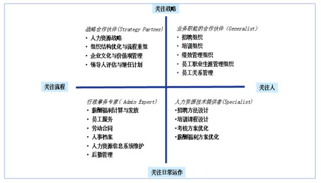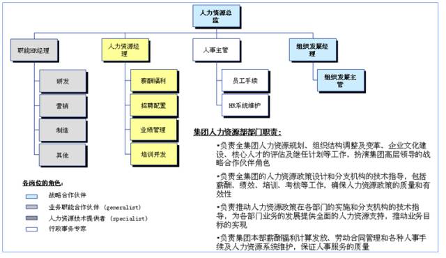 其中,部門(mén)職責(zé)是在公司戰(zhàn)略的指導(dǎo)下、基于部門(mén)角色確定的,以集團(tuán)人力資源部為例,如下圖所示,其扮演四種角色:戰(zhàn)略合作伙伴、業(yè)務(wù)職能的合作伙伴、人力資源技術(shù)提供者和行政事務(wù)專(zhuān)家,要扮演好不同的角色,就需要有相應(yīng)的職責(zé)進(jìn)行支撐。