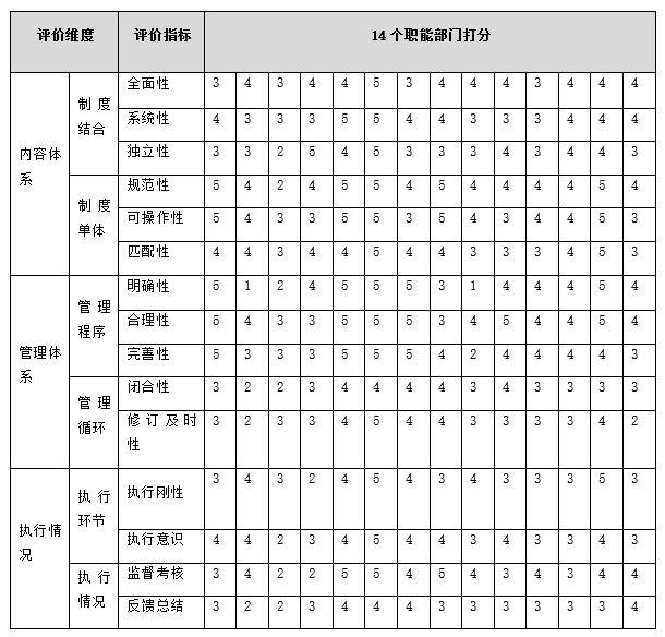 (2) 由綜合管理部牽頭,組織集團各職能部門負責人,針對各下屬企業(yè)制度管理情況進行評估和打分。其中,十四個職能部門,每個部分派一名領導或代表參與打分,評分標準按1-5分,從低到高,1分代表最差,5分代表最好。