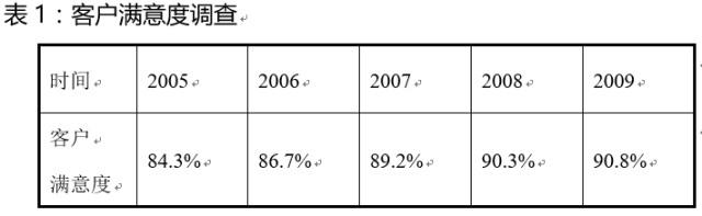 可見(jiàn),從2005年起,客戶滿意度都達(dá)到滿意的程度,并且客戶滿意度逐年提高,這是一個(gè)好的趨勢(shì),但是,也應(yīng)該看到,提高幅度并不大,也沒(méi)有達(dá)到很滿意的程度,還有很大的提升空間。