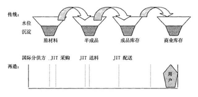 物流整合開始后,第一步就是整合采購,將集團(tuán)所有事業(yè)部的物資集中采購,通過規(guī)模優(yōu)勢,納入國際化供應(yīng)商,在全球范圍內(nèi)采購質(zhì)優(yōu)價(jià)廉的零部件,既降低產(chǎn)品成本、提高產(chǎn)品的競爭力,又保持了產(chǎn)品質(zhì)量的一致性。有的分供方還直接參與了海爾的產(chǎn)品設(shè)計(jì),通過與國際化分供方建立起密切合作的伙伴關(guān)系,實(shí)現(xiàn)了采購JIT。同時(shí),在內(nèi)部實(shí)施ERP管理系統(tǒng),通過以ERP為后臺的B2B網(wǎng)上采購與網(wǎng)上招標(biāo)、網(wǎng)上支付,實(shí)現(xiàn)了集團(tuán)內(nèi)部生產(chǎn)、庫存、銷售、財(cái)務(wù)、人力資源與外部供應(yīng)商和分銷商信息的共享與共同計(jì)劃,最大限度地縮短了采購周期。在儲運(yùn)方面,統(tǒng)一運(yùn)輸,優(yōu)化運(yùn)輸網(wǎng)絡(luò),通過SST機(jī)制整合郵政的配送網(wǎng)絡(luò),為零距離銷售提供了保證。在生產(chǎn)物資配送方面,實(shí)施JIT送料,加快了庫存資金的周轉(zhuǎn)速度,減少了呆滯物資。整合前,各配送處以滿足生產(chǎn)不停線為目標(biāo),生產(chǎn)線用量往往達(dá)不到2天以上,遇到計(jì)劃變動,有些物料又未及時(shí)辦理退庫,時(shí)間一長就會變成呆滯物料,造成浪費(fèi);整合后,物流的目標(biāo)是零庫存資金占用,在這個(gè)思想的指導(dǎo)下,推行了4HJIT送料,即控制物資在線時(shí)間不得超過4個(gè)小時(shí),超過4小時(shí)立即退庫查明原因,按照SST契約進(jìn)行處理,1小時(shí)之內(nèi)的立即補(bǔ)料,使現(xiàn)場明亮整潔,呆滯物資減少了50%。1999年9月15日,國際化的海爾物流中心啟用,物流中心擁有9160個(gè)庫位,采用世界最為先進(jìn)的資源管理集成系統(tǒng),實(shí)行“JIT"生產(chǎn)模式管理。流程再造前后物流對照如下圖所示。
