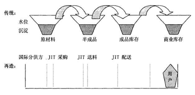 物流整合開(kāi)始后,第一步就是整合采購(gòu),將集團(tuán)所有事業(yè)部的物資集中采購(gòu),通過(guò)規(guī)模優(yōu)勢(shì),納入國(guó)際化供應(yīng)商,在全球范圍內(nèi)采購(gòu)質(zhì)優(yōu)價(jià)廉的零部件,既降低產(chǎn)品成本、提高產(chǎn)品的競(jìng)爭(zhēng)力,又保持了產(chǎn)品質(zhì)量的一致性。有的分供方還直接參與了海爾的產(chǎn)品設(shè)計(jì),通過(guò)與國(guó)際化分供方建立起密切合作的伙伴關(guān)系,實(shí)現(xiàn)了采購(gòu)JIT。同時(shí),在內(nèi)部實(shí)施ERP管理系統(tǒng),通過(guò)以ERP為后臺(tái)的B2B網(wǎng)上采購(gòu)與網(wǎng)上招標(biāo)、網(wǎng)上支付,實(shí)現(xiàn)了集團(tuán)內(nèi)部生產(chǎn)、庫(kù)存、銷售、財(cái)務(wù)、人力資源與外部供應(yīng)商和分銷商信息的共享與共同計(jì)劃,最大限度地縮短了采購(gòu)周期。在儲(chǔ)運(yùn)方面,統(tǒng)一運(yùn)輸,優(yōu)化運(yùn)輸網(wǎng)絡(luò),通過(guò)SST機(jī)制整合郵政的配送網(wǎng)絡(luò),為零距離銷售提供了保證。在生產(chǎn)物資配送方面,實(shí)施JIT送料,加快了庫(kù)存資金的周轉(zhuǎn)速度,減少了呆滯物資。整合前,各配送處以滿足生產(chǎn)不停線為目標(biāo),生產(chǎn)線用量往往達(dá)不到2天以上,遇到計(jì)劃變動(dòng),有些物料又未及時(shí)辦理退庫(kù),時(shí)間一長(zhǎng)就會(huì)變成呆滯物料,造成浪費(fèi);整合后,物流的目標(biāo)是零庫(kù)存資金占用,在這個(gè)思想的指導(dǎo)下,推行了4HJIT送料,即控制物資在線時(shí)間不得超過(guò)4個(gè)小時(shí),超過(guò)4小時(shí)立即退庫(kù)查明原因,按照SST契約進(jìn)行處理,1小時(shí)之內(nèi)的立即補(bǔ)料,使現(xiàn)場(chǎng)明亮整潔,呆滯物資減少了50%。1999年9月15日,國(guó)際化的海爾物流中心啟用,物流中心擁有9160個(gè)庫(kù)位,采用世界最為先進(jìn)的資源管理集成系統(tǒng),實(shí)行“JIT"生產(chǎn)模式管理。流程再造前后物流對(duì)照如下圖3所示。