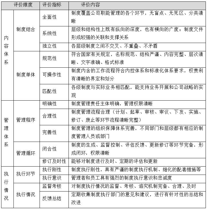 經(jīng)研究,本次評(píng)估內(nèi)容包括制度內(nèi)容評(píng)估、制度管理體系評(píng)估、制度執(zhí)行情況評(píng)估三個(gè)方面,為此設(shè)計(jì)評(píng)價(jià)指標(biāo)15個(gè)指標(biāo),對(duì)應(yīng)評(píng)價(jià)的15個(gè)要素。