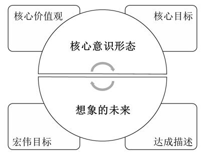 愿景由兩個(gè)主要部分構(gòu)成:一是“核心意識(shí)形態(tài)”(核心價(jià)值觀、核心目標(biāo));二是“想象中的未來(lái)”(10-30年宏偉目標(biāo)的描述),其中: